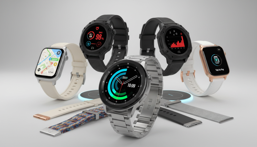 Smartwatches are wrist-worn devices that blend traditional timekeeping with digital intelligence. This category covers fitness trackers and full-featured watches that run apps, deliver notifications, track health data, and offer GPS and mobile payments. Designs range from rugged sport models to sleek, dressy styles with interchangeable bands and durable materials like aluminum or stainless steel.